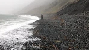 Scott Birk is nearly washed out to sea attempting to cross a rain swollen creek on the Lost Coast Trail.
