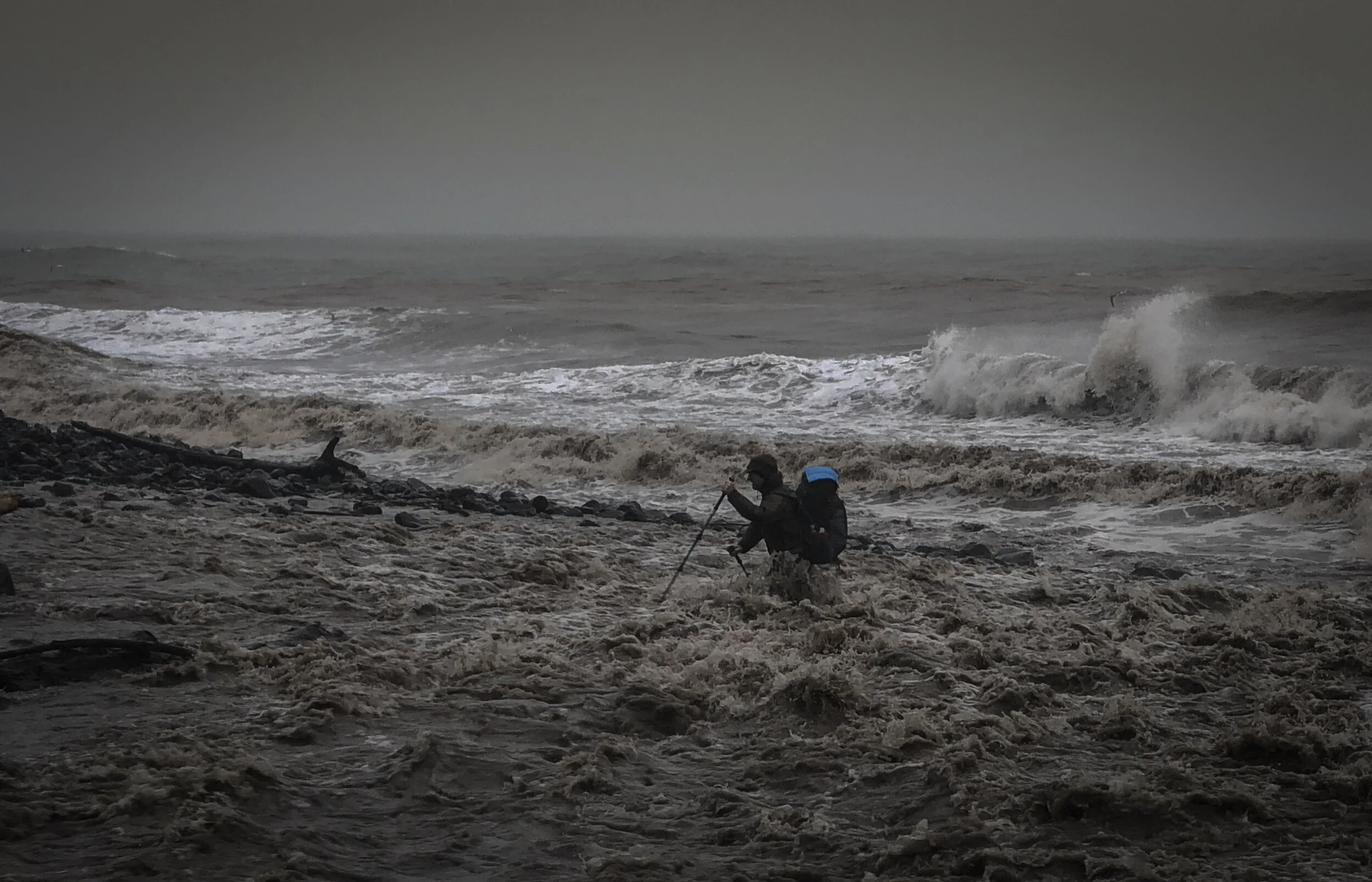 Scott Birk is nearly washed out to sea attempting to cross a rain swollen creek on the Lost Coast Trail.